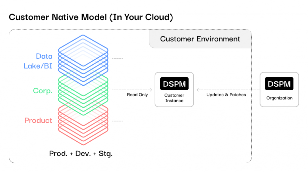 What is Customer Native DSPM? Customer Native DSPM refers to a data security approach where the DSPM solution is deployed and operates solely within the customer’s own cloud or on-premise environment and infrastructure, rather than from being delivered as an external service. Also referred to as an In-Your-Cloud deployment.